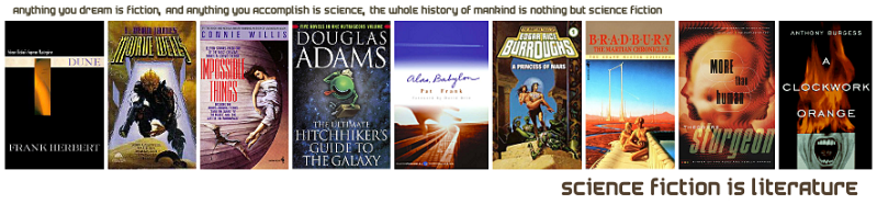 Dune by Frank Herbert | Mojave Wells by L. Dean James | Impossible Things by Connie Willis | The Ultimate Hitchhiker's Guide to the Galaxy by Douglas Adams | Alas, Babylon by Pat Frank | A Princess of Mars by Edgar Rice Burroughs | The Martian Chronicles by Ray Bradbury | More Than Human by Theodore Sturgeon | A Clockwork Orange by Anthony Burgess | quote by Ray Bradbury